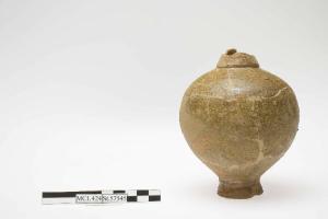 Olpe invetriata, mutila di orlo, ansa e parte di collo. Collo svasato distinto dal corpo globoso, alto piede svasato a disco. Invetriatura giallo verdastro.