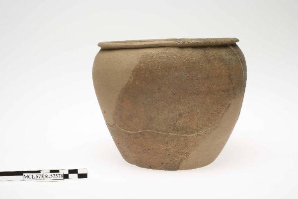 Olla con orlo estroflesso distinto mediante breve gola dal corpo troncoconico, fondo piano.