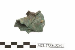 Lamina bronzea (disco pertinente una fibula discoidale?). Deformato dal calore, al centro si noto un attacco in ferro; il margine era decorato da due file di puntini impressi.