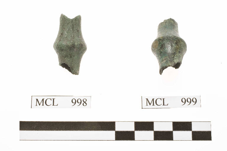 Perla di orecchino in bronzo di forma biconica a lati inflessi.