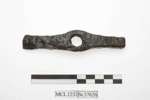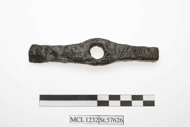 Martello in ferro. Sezione quadrangolare, leggermente ingrossato all'altezza del foro circolare, penna smussata.