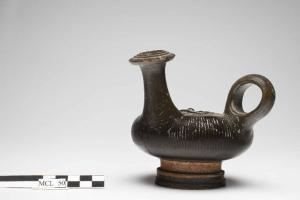 Guttus a vernice nera con Gorgone in rilievo. Alto piede formato da tre listelli sovrapposti di diametro digradante a fondo convesso. Corpo espanso arrotondato, molto schiacciato. Bocca cilindrica con labbro espanso estroflesso. Corpo decorato lateralmente da incisioni verticali parallele.