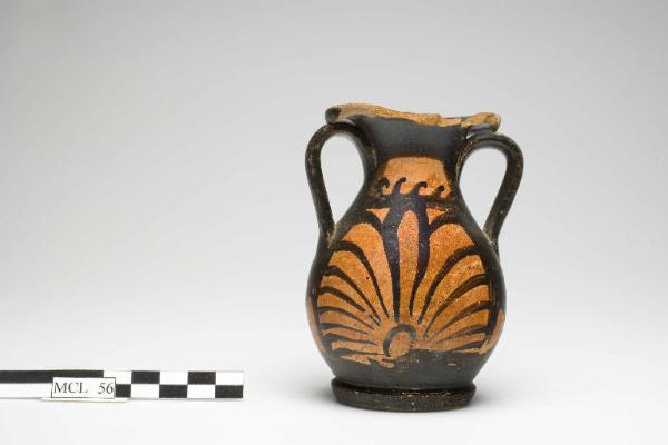 Pelike a figure rosse con piede ad anello e corpo piriforme panciuto; breve e largo collo concavo con orlo estroflesso a margine quasi rettilineo. Anse a bastoncello schiacciato. Decorazione: sul collo meandro, sul corpo da una parte testa femminile a sinistra tra elementi vegetali, dall'altra palmetta.