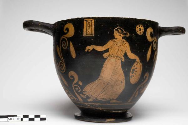 Skyphos a figure rosse. Piede anulare schiacciato, tozzo corpo caliciforme con diametro massimo poco sotto l'orlo indistinto, dove si innestano due anse nastriformi orizzontali arrotondate, con anello rialzato. Sotto le anse coppia di palmette. Sulle due facce, tra girali e volute, da una parte menade con timpano, gradiente a destra con viso a sinistra; dall'altra efebo ignudo gradiente a sinistra con mantello sul braccio.