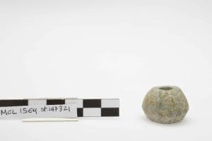 Semplice fuseruola in pietra ollare di forma biconica e fondo piatto.