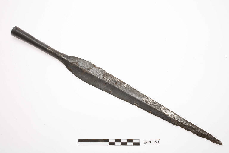 Punta di lancia in ferro con innesto a cannone, lama di forma lunga e assottigliata con debole costolatura centrale; alla base del cannone presenza di un foro di per il fissaggio dell'asta lignea.