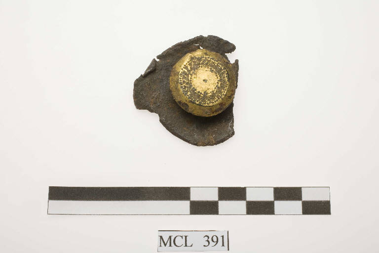 Borchia in rame dorato ornata da punzonature, pertinente l'imbracciatura di uno scudo da parata, di cui un frammento è ancora unito alla borchia.