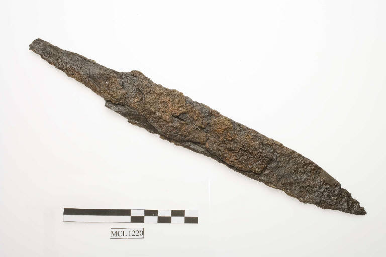 Sax corto in ferro, lama triangolare a un taglio, codolo a sezione rettangolare, rastremato all'estremità