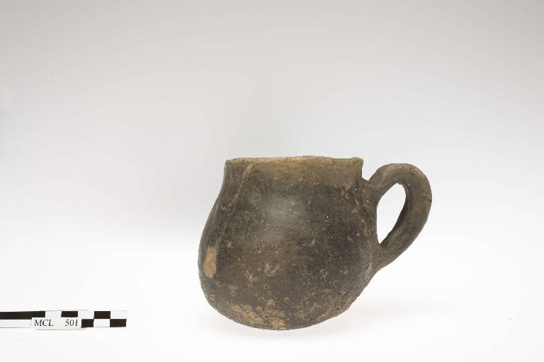 Boccale globoso monoansato, orlo arrotondato diritto, fondo piatto. Ansa a orecchio a sezione ovale.