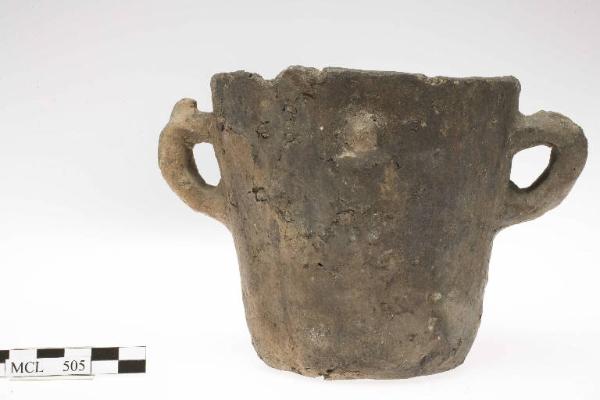 Boccale troncoconico biansato, orlo appiattito, fondo piatto. Decorazione a bugnette sotto l'orlo. Anse ad anello a sezione ovale.