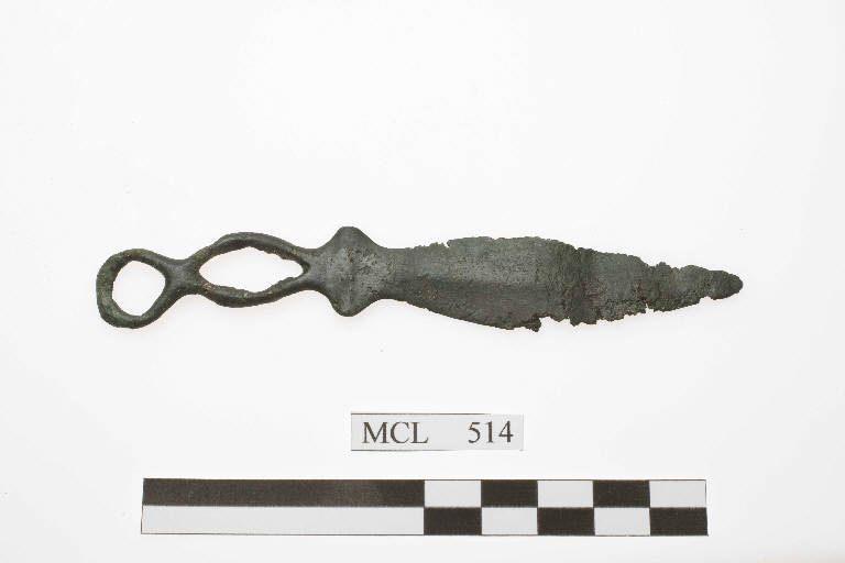 Pugnaletto in bronzo tipo Voghera., caratterizzato da manico a giorno e lama a foglia d'ulivo, con un setto espanso di distinzione tra manico e lama.
