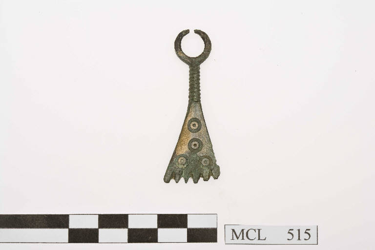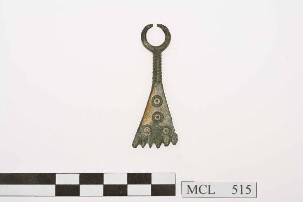 Pendaglio in bronzo di forma triangolare, con una seghettatura lungo il margine inferiore e decorazione a occhi di dado.