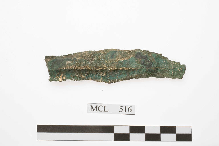 Lama di pugnale in bronzo priva della base e della punta, deformata; ha forma a foglia d'ulivo e presenta una larga costolatura mediana arrotondata.