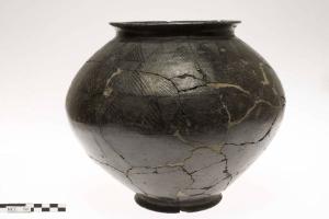 Olla biconico/ovoide. Orlo arrotondato estroflesso, fondo a tacco lievemente concavo. Presenza di un piccolo foro sulla spalla. Decorazione a stralucido: sulla parte superiore del vaso tre fasce di triangoli campiti a tratteggio con i vertici rivolti verso l¿alto; le tre fasce sono incorniciate da linee continue, la fascia più bassa è definita inferiormente da una fascia a trattini obliqui.