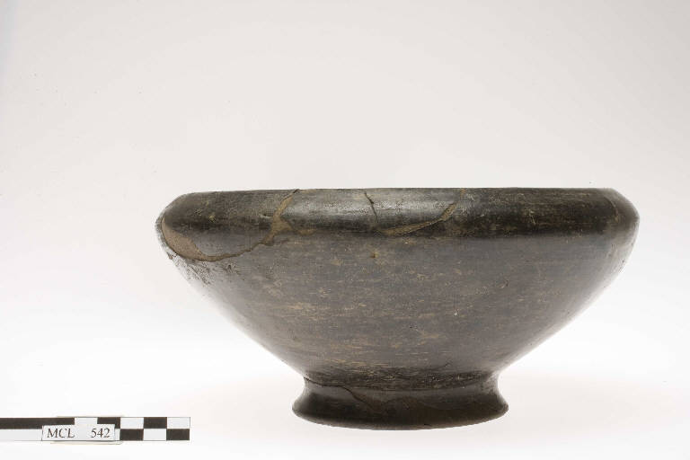 Ciotola troncoconica con orlo arrotondato introflesso e basso piede ad anello.