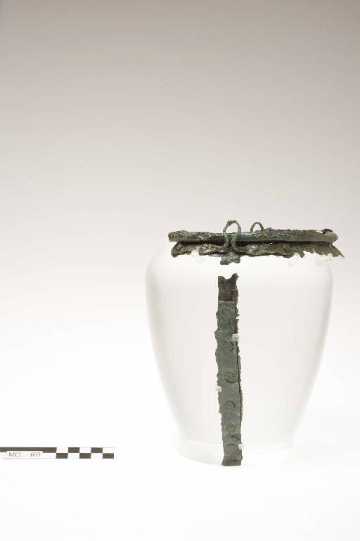 Situla in bronzo a corpo troncoconico, spalla alta poco pronunciata, assenza di collo, bordo avvolto intorno ad un anello di ferro di rinforzo, attacchi ad Omega con piastrine rettangolari fissate ciascuna con due ribattini.