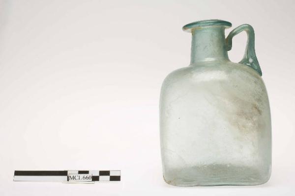 Bottiglia vitrea quadrangolare, vetro azzurrino. Collo cilindrico con labbro orizzontale ripiegato, ansa nastriforme ripiegata impostata sulla spalla e sul collo.