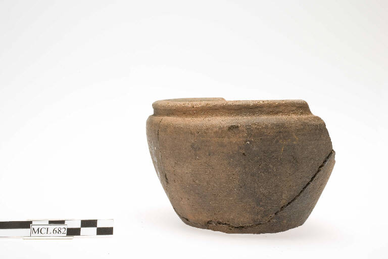 Olla con orlo arrotondato a sezione semicircolare distinto dalla spalla, corpo troncoconico, fondo piano.