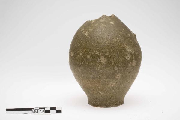 Olpe ovoide con invetriatura verdastra, mutila del collo e dell'ansa, piede a disco.