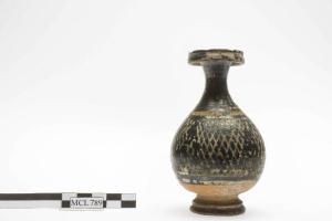 Aryballos panciuto decorato con motivo a reticolo sovradipinto.