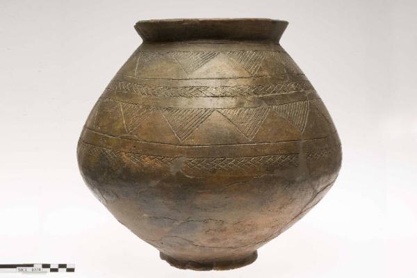 Olla biconica/ovoide. Orlo arrotondato estroflesso, fondo a tacco concavo. Decorazione incisa sulla parte superiore del vaso: due fasce di triangoli campiti a tratteggio alternate da due fasce a reticolo; la fascia inferiore di triangoli è interrotta da un motivo divisorio di due linee verticali lievemente convergenti definite esternamente da un motivo a reticolo.