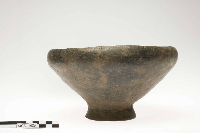 Coppa su basso piede. Orlo a scivolo interno leggermente introflesso, vasca troncoconica, basso piede svasato, fondo piatto.