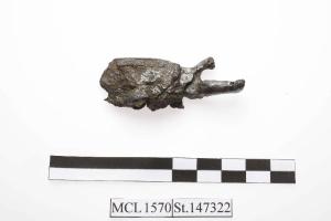 Fibbia di cintura in ferro con placca fissa a U con tracce di decorazione ageminata sull'anello e sull'ardiglione, costituite da brevi linee parallele.