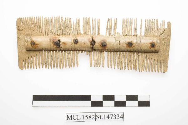 Pettine in osso a doppia fila di denti, una a maglia stretta e una a maglia larga con impugnatura decorata da fasce di linee incise trasversali.