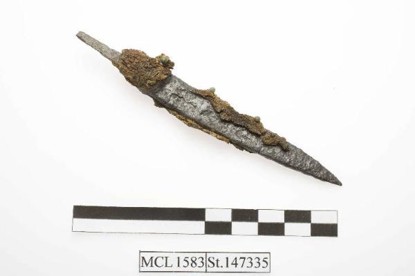 Coltello in ferro con codolo a sezione rettangolare. Si conservano tracce del fodero in cuoio, chiuso sul lato della lama da tre ribattini in bronzo a capocchia cilindrica.