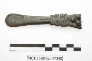 Puntale di cintura in bronzo del tipo a "cinque pezzi", di forma allungata e con la parte superiore decorata a occhi di dado.