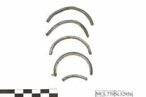 Frammento di orecchino in bronzo del tipo ad anello con allacciatura ad occhiello, sezione quadrangolare.