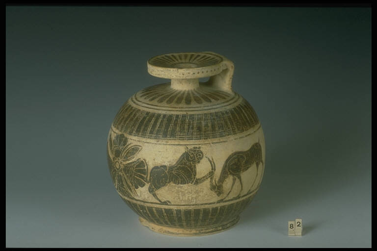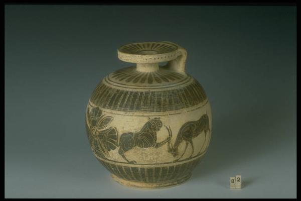 Fregio zoomorfo: ai lati di una palmetta capra e pantera affrontati, leone e capra, leone retrospiciente. Decorazione accessoria: fasce a finta baccellatura, linguette sulla spalla e sul labbro.,