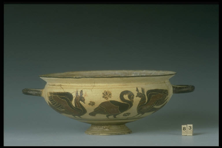 Fregio zoomorfo: tre volatili su ogni lato, uno sotto ciascuna ansa; nel campo rosette. Decorazione accessoria a linee e fasce.,