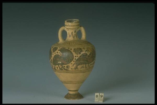 Fregio zoomorfo: anatre retrospicienti, nel campo rosette e puntini. Decorazione accessoria a fasce, linee, linguette e zig-zag.,