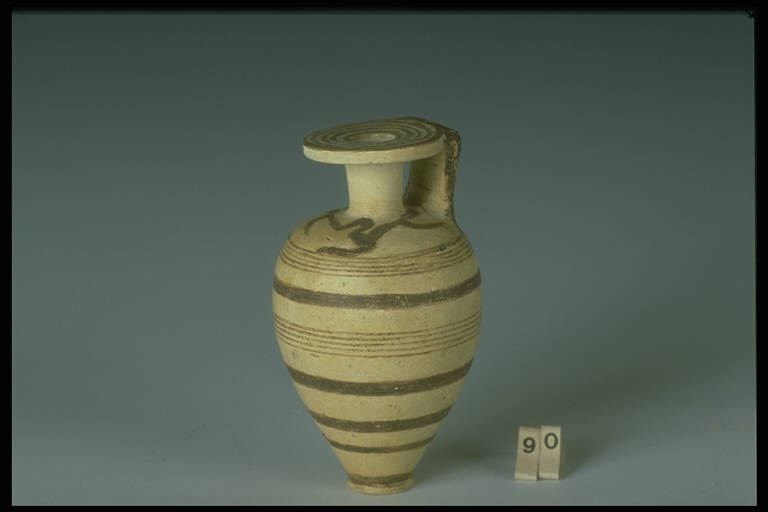 Labbro a disco piatto aggettante, collo cilindrico, corpo fusiforme, ansa a nastro decorazione a fasce e linee, motivi curvilinei sulla spalla e sull'ansa, cerchi concentrici sul labbro.