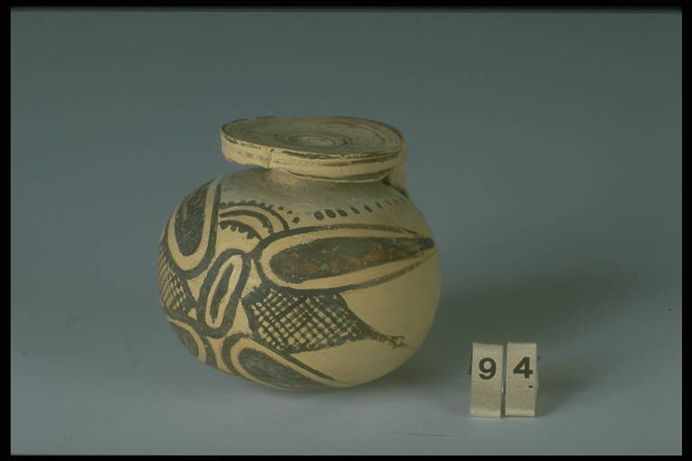 Labbro a disco piatto aggettante, corpo globulare, fondo arrotondato e umbilicato, ansa a nastro. Decorazione a palmetta e reticolo sul corpo, linee e cerchi concentrici sul labbro.