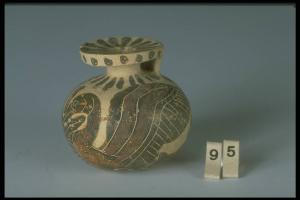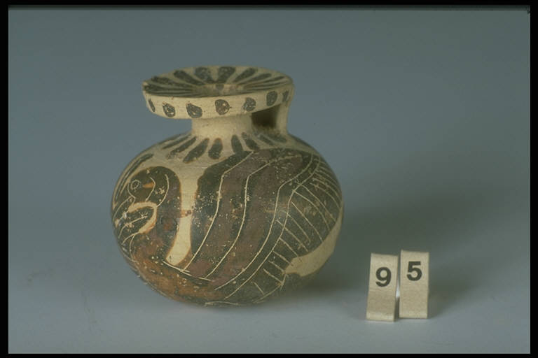 Sul corpo cigno ad ali spiegate. Decorazione accessoria: raggera sul labbro, puntini, segmenti e rosette.,