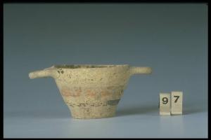 Orlo arrotondato, vasca cilindroide, fondo piatto. Decorazione a fasce.