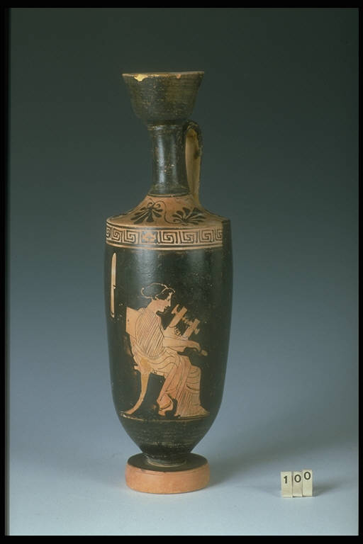 Suonatrice di lira con chitone e capelli raccolti con una benda, seduta di profilo; nel campo una benda. Decorazione accessoria: sulla spalla fregio a palmette, fascia a meandro al di sopra della scena figurata.,