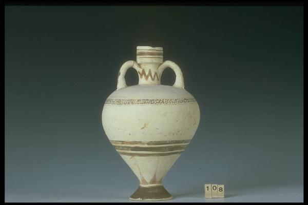 Labbro verticale, collo cilindrico, corpo ovoidale rastremato, piede troncoconico. Decorazione a bande, zig-zag e denti di lupo.