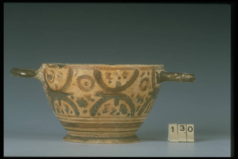 Orlo arrotondato introflesso, vasca ovoidale, piede troncoconico, anse a bastoncello. Decorazione con motivo a semicerchi contrapposti e collegati da un segno a croce tra cerchi e punti; fasce nella zona inferiore.