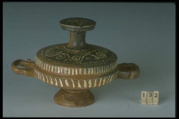 Piede troncoconico con taglio e breve collo, vasca a tesa obliqua carenata, orlo a disco rientrante per l'alloggio del coperchio, anse laterali a bastoncello con linguette di presa; coperchio troncoconico con labbro verticale e pomello costituito da un elemento cilindrico ed uno ad echino. Decorazione a linguette parallele sulla vasca e sul bordo del coperchio; tralci a volute tra puntini sul cope