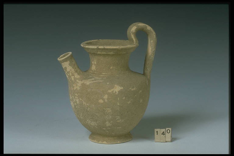 Labbro piatto aggettante, collo a profilo concavo, corpo ovoidale, piede troncoconico, ansa a nastro sormontante, versatoio cilindrico.