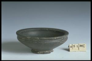 Imboccatura dal labbro largo, piatto, legg. obliquo verso l'interno; gola all'attacco della spalla; spalla carenata a profilo convesso; vasca troncoconica, profonda, dalle pareti spesse e oblique; piede troncoconico, con scanalatura all'attacco della vasca, faccia esterna tagliata da una risega, fondo esterno pieno e piatto