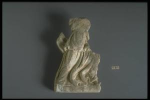 Frammento forse pertinente a timpano con figura femminile (Menade ?) corrente su base parallelepipeda.