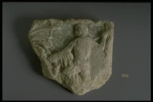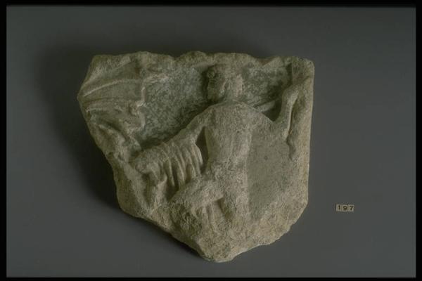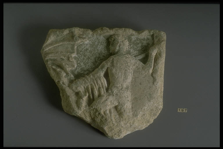 Frammento di rilievo con un guerriero nudo di spalle, con lancia nella mano destra; resta la clamide di un secondo guerriero