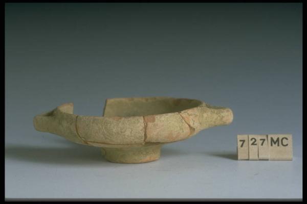 Orlo arrotondato introflesso, vasca a profilo convesso, piede cilindrico, anse orizzontali a bastoncello.
