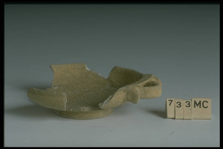 Orlo piatto distinto da una risega, vasca emisferica, piede troncoconico, ansa orizzontale a bastoncello con terminazioni ripiegate.