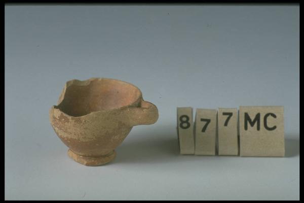 Orlo arrotondato introflesso, vasca emisferica con leggera carenatura, piede troncoconico, anse orizzontali a bastoncello.