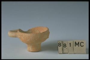 Orlo arrotondato introflesso, vasca emisferica con leggera carenatura, piede troncoconico, anse orizzontali a bastoncello.
